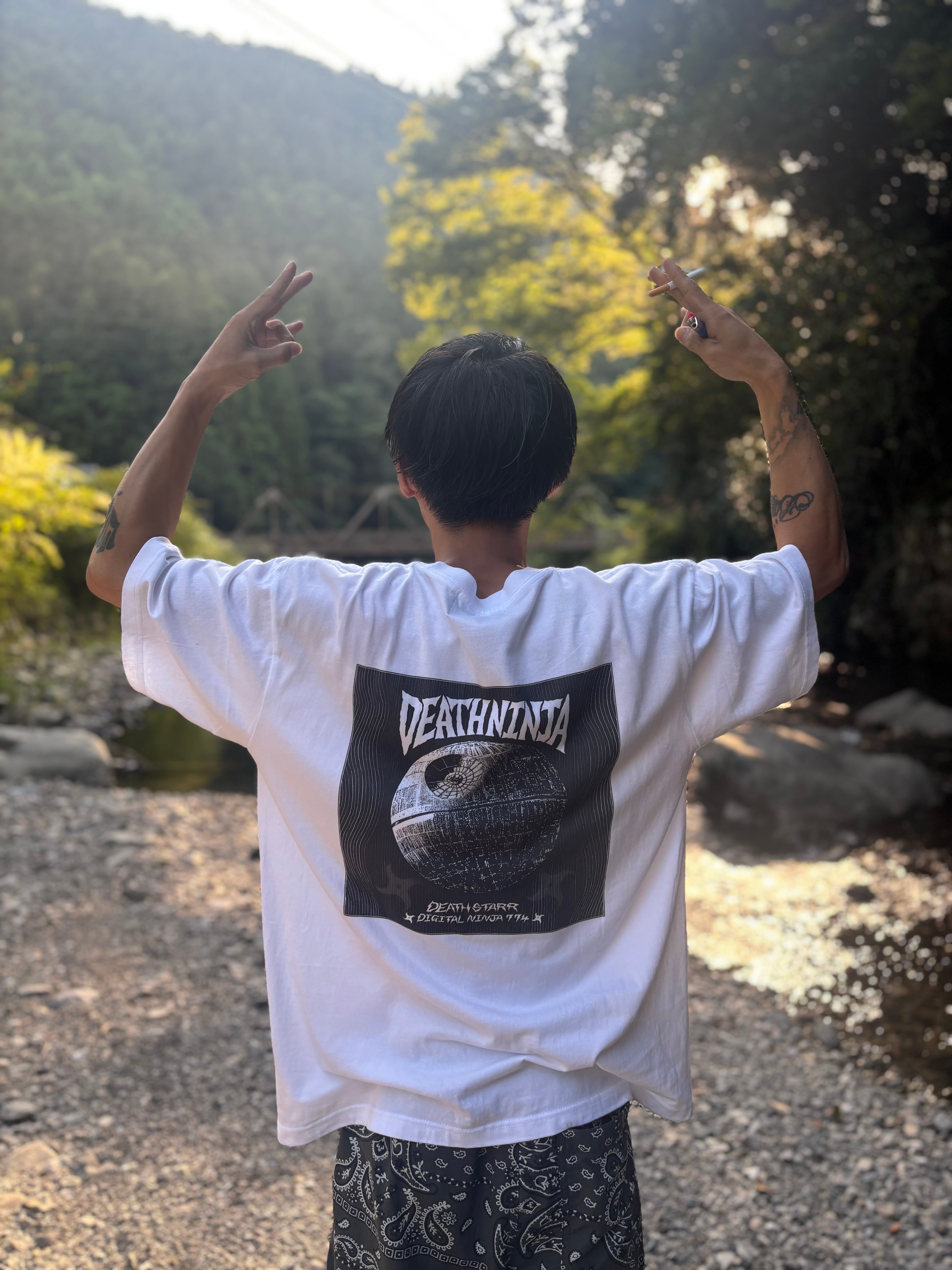 DEATHSTARR(Hr.Sticko,CHAKRA,TRASH,ジャッキーゲン)とDIGITAL NINJAがタッグを組み制作したEP「DEATH NINJA」のジャケットを背面にプリント、前面はDEATH NINJAのロゴを刺繍で落とし込んだ激渋なデザインのTシャツ。